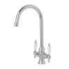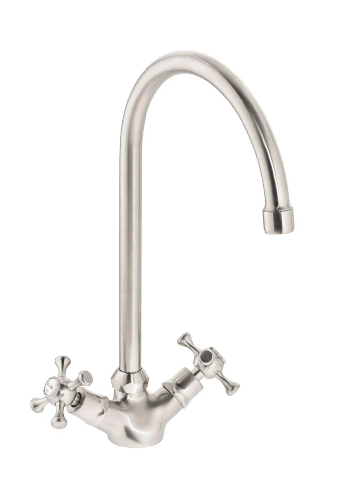 ΒΌ turn operation with easy to use cross handles, built-in aerator and swivel spout. Traditional design with a brushed nickel finish.