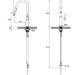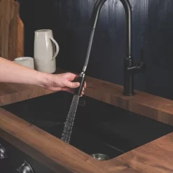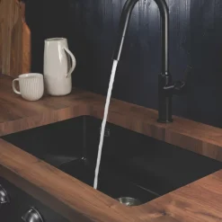 Ultra-modern and sophisticated slimline design. Features smooth pull-out spout with twin-flow options for various kitchen tasks.