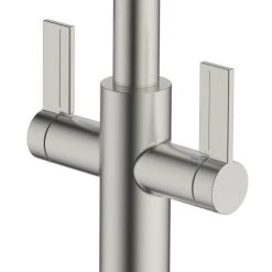 Ultra-modern, pragmatic design. Features easy to operate high-set controls and useful pull-out spout with twin-flow options for various kitchen tasks.