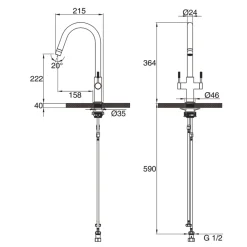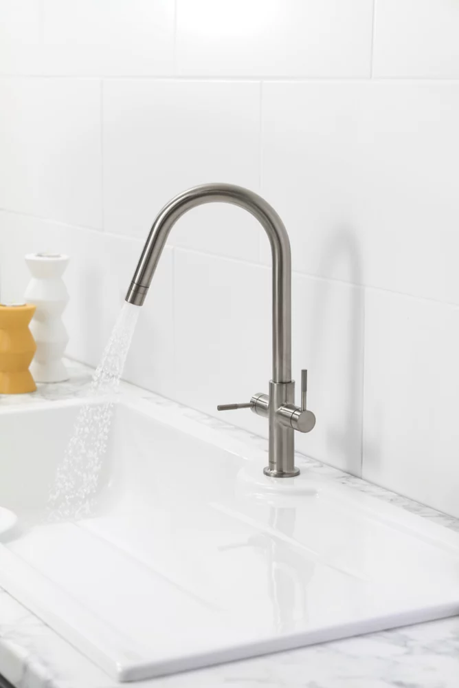 Slimline, urban design with minimalist high-set knurled controls. Twist and spray aerator provides non-splash, aerated water flow or needle-jet spray, ideal for jobs such as rinsing plates, changed with a simple twist of the flange.