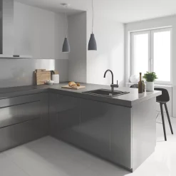 Clean and flexible. Simple to install due to easy installation system. Features C-shaped high spout that can be fixed or limited to turn either 150Λor 360Λ. Maintains water and temperature control. Velvet Black scratch-resistant finish.