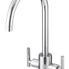 Contemporary design with swan neck swivel spout. Features built-in aerator and temperature limit stop.
