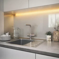 Touch-activated tap. Dispenses cold water which is filtered to remove impurities for improved taste, or near-boiling water which is ideal for making hot drinks and food preparation. Compact and quiet tank sits inside cupboard under the sink and has an adjustable dial to set temperature between 88-99°C. Safety spring lock push-down lever immediately springs back into place to help reduce water wastage and prevent hot water running unattended. Smooth and fine laminar water flow prevents spraying and spitting to reduce risk of scalding or burning.